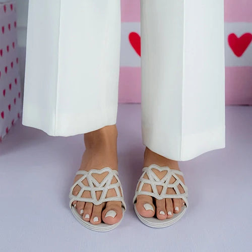 The ORAN slides are your go-to summer flats! Easy to slip on & off, the intricate pattern with a hidden heart in the centre adds a cute, feminine touch to these slides. Available in two colourways.
