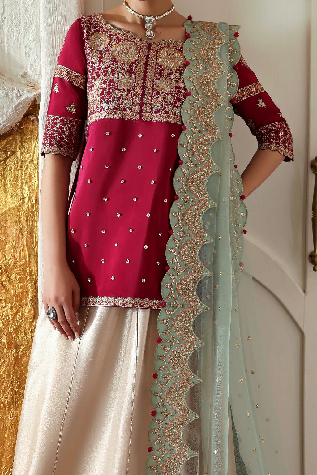 Magenta embroidered short shirt adorned with tassels, paired with light gold tissue lehnga featuring matching tassel accents. Styled with a contrasting aqua net dupatta with scalloped embellished borders.