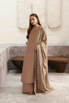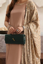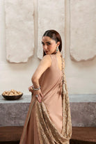 A luxe beige-gold embellished shawl styled with a raw silk long shirt adorned with intricate embroidered borders and tassels, paired gracefully with raw silk trousers