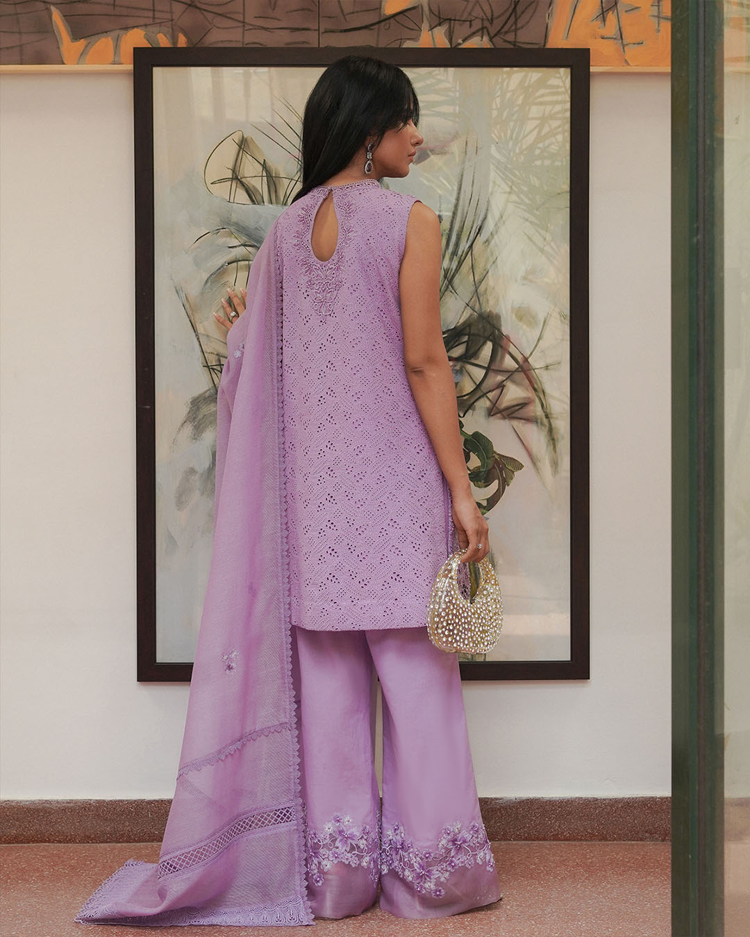 Capturing the striking allure of contemporary silhouettes, Rivka simply mesmerises. Crafted from a luxurious lawn, the lilac shirt features artistically arranged resham, moti and cutdana embellishments. Paired with embellished lawn flared pants and an embroidered cotton net dupatta, this ensemble is a versatile option that can be styled multiple ways for a look that personifies effortless luxury.