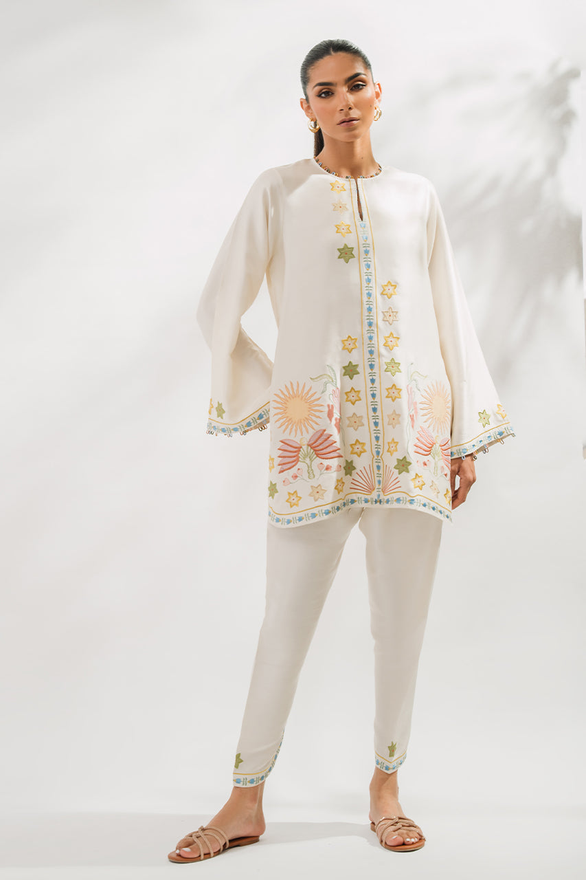 An ivory rawsilk co-ord set featuring a top and shalwar is adorned with pastel hued embroidered details and appliquéd accents.