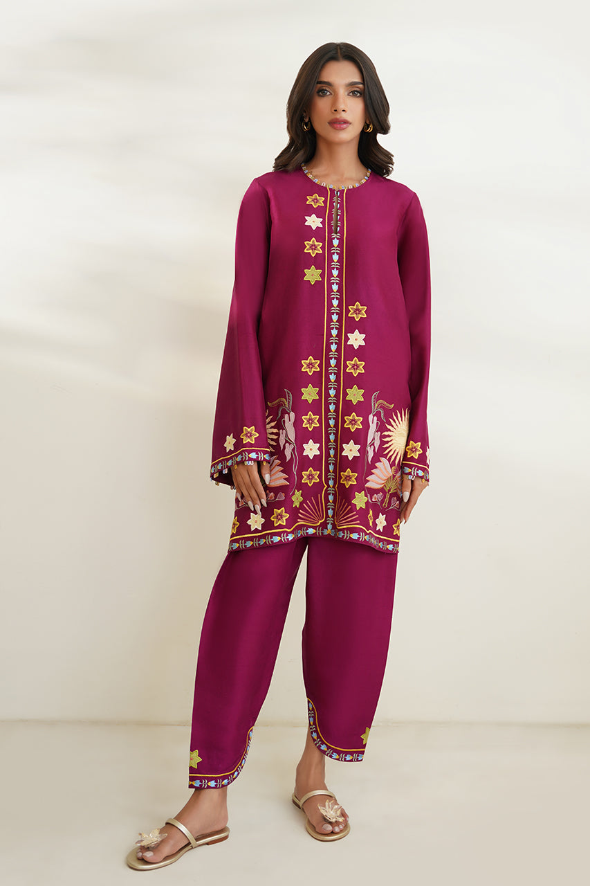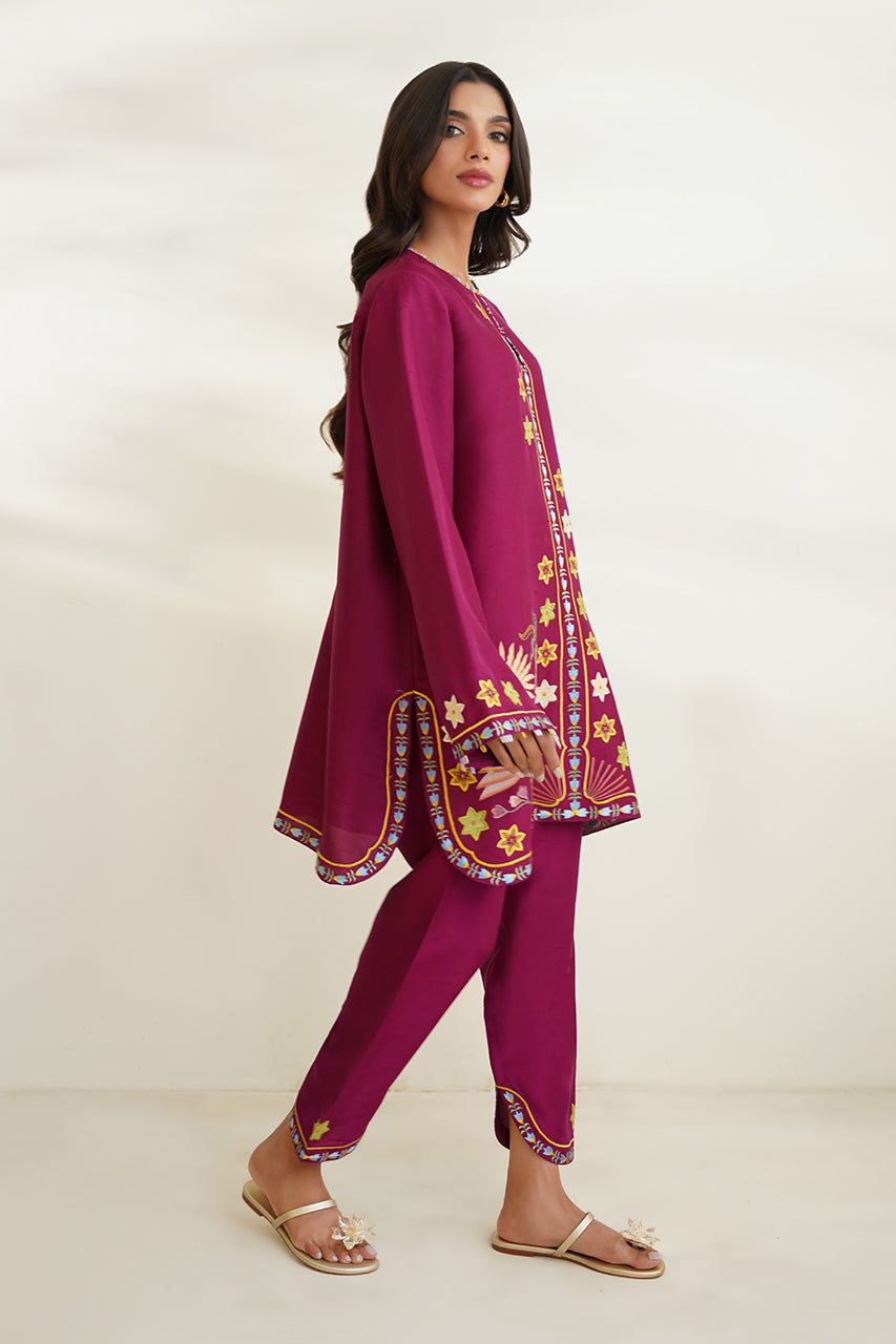 A mulberry rawsilk co-ord set featuring a top and shalwar is adorned with pastel hued embroidered details and appliqued accents.