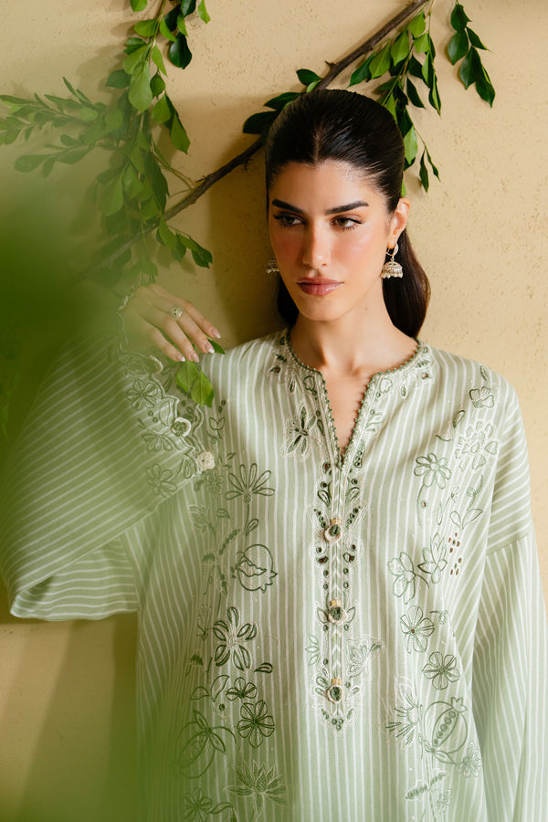 Draped in sage-green Irish linen, this ensemble carries the hush of autumn skies at dawn. Whispering stripes flow like early morning mist, while delicate florals and butterfly motifs bloom in ivory and faded gold, as though pressed between the pages of nature’s own diary. Scalloped sleeves fall with the softness of leaves at dusk, and embroidered trousers complete the look — a drifting melody of fabric, flowers, and wings, evoking the dreamlike stillness of an autumn garden.