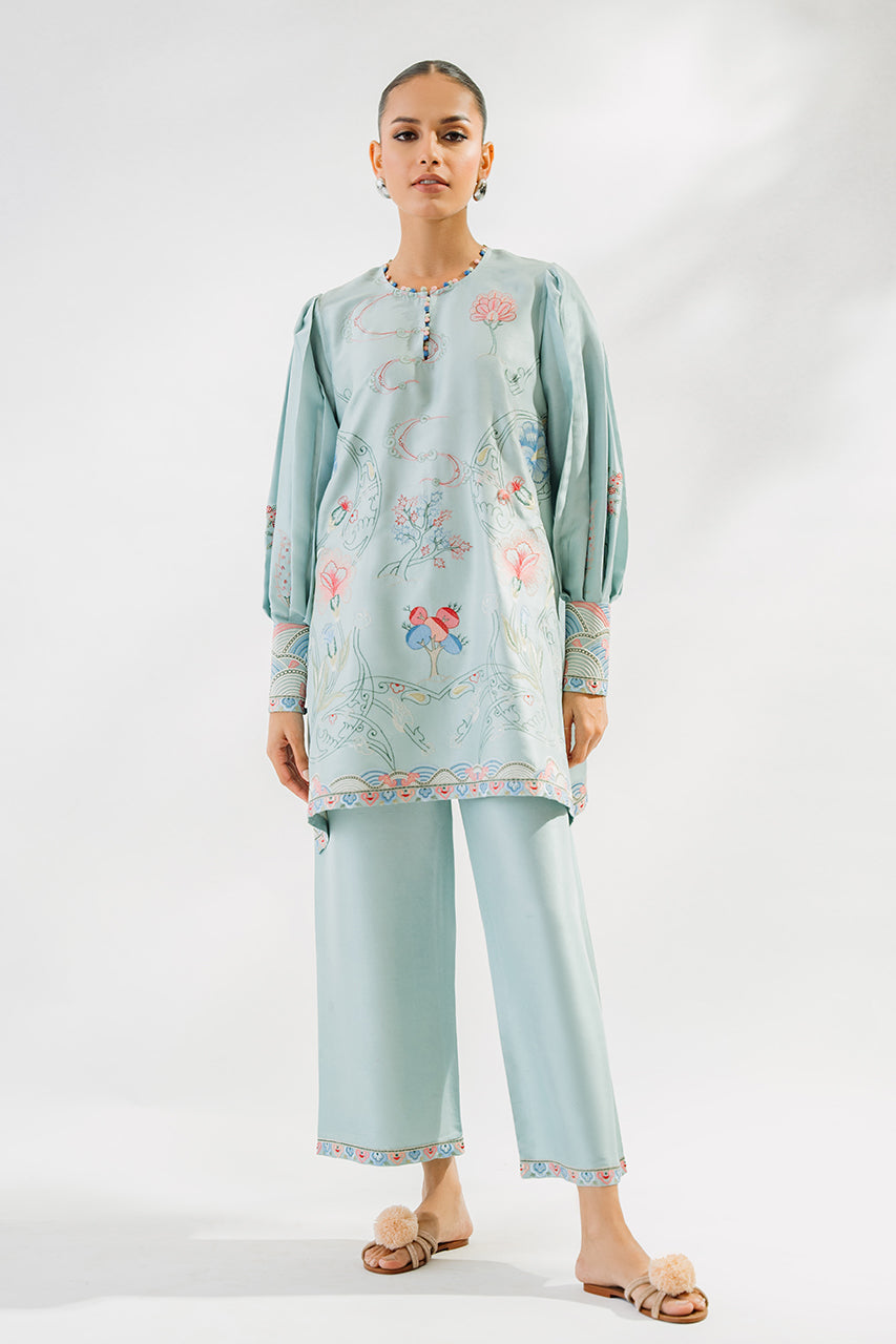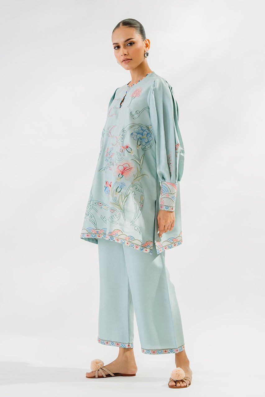 A short embroidered celadon blue top cut from rawsilk features a fabric manipulated neckline and gathered sleeves with cuffs. Paired with matching rawsilk culottes.