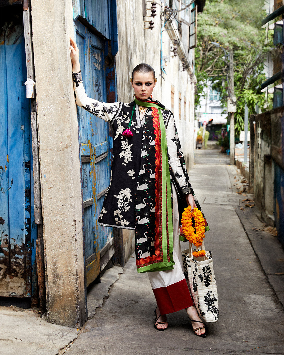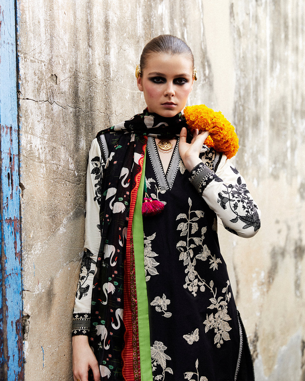 Product Description: A celestial blend of elegance and grace. Featuring a silk dupatta with a delicate swan print and satin silk hemming, paired with a black cotton shirt adorned with ivory floral embroidery and ivory sleeves with intricate black embroidery. Completed with ivory trousers featuring a bold red color block patch, this ensemble exudes sophistication with a modern edge.
