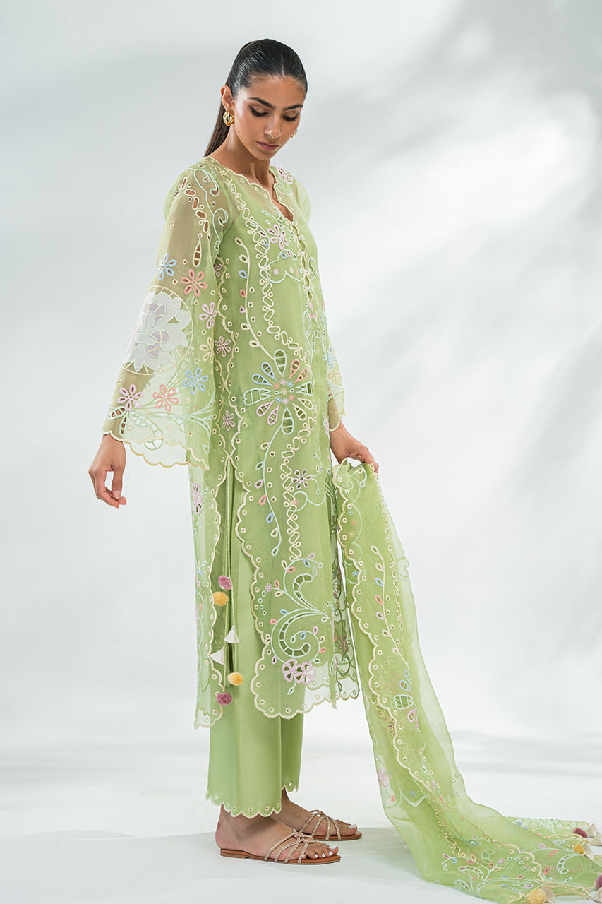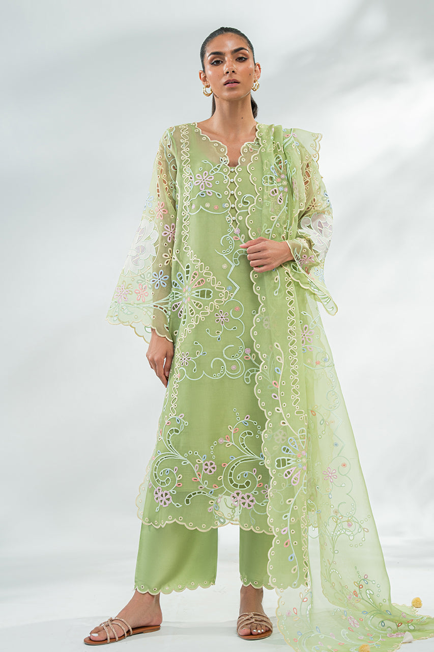 A timeless organza kurta and dupatta are rendered with a playful fusion of cutwork and signature SM floral embroidery in pastel shades over a lemon green base. Rawsilk culottes with scalloped edges and tassel detailing complement the look.