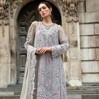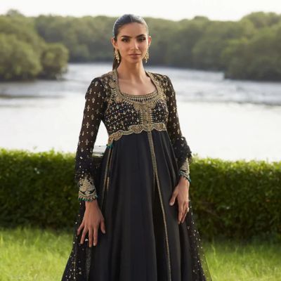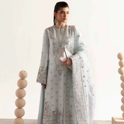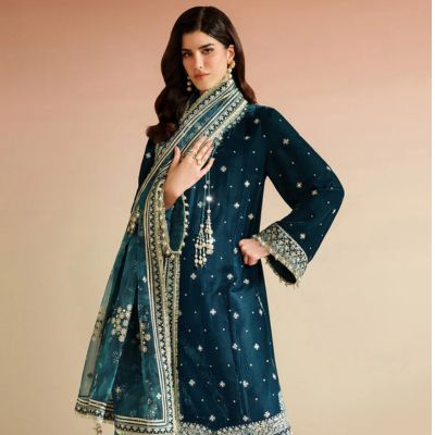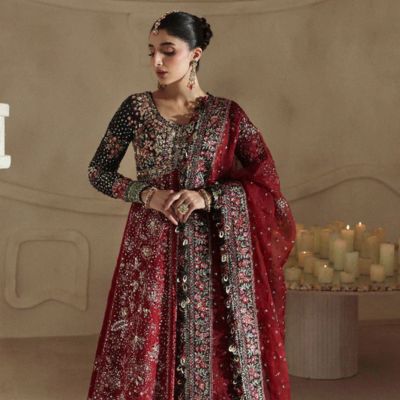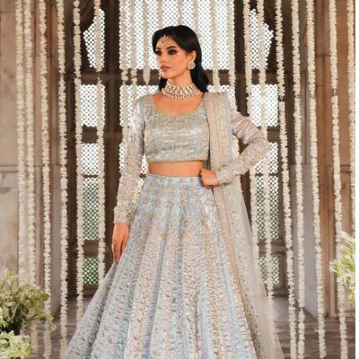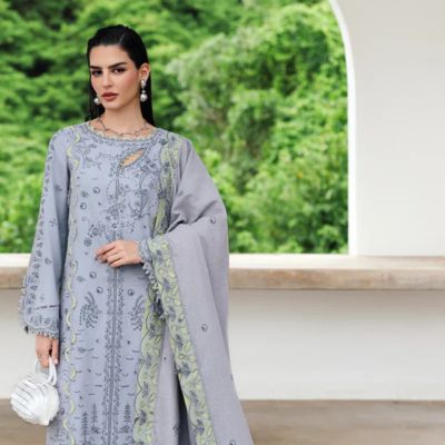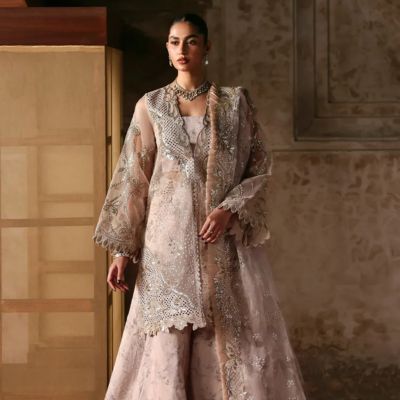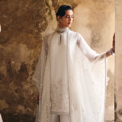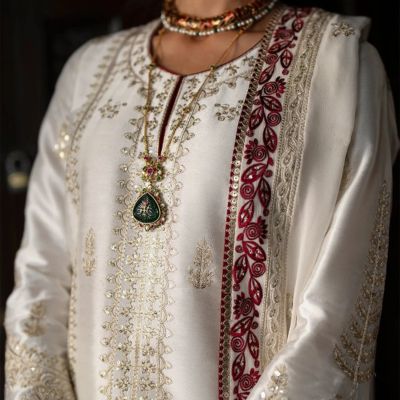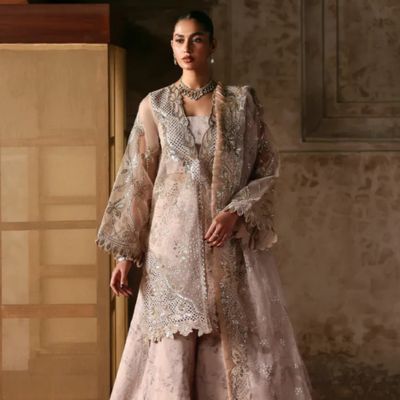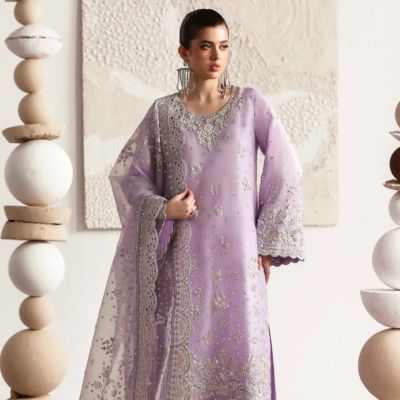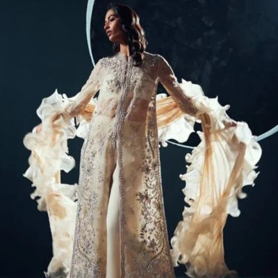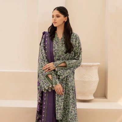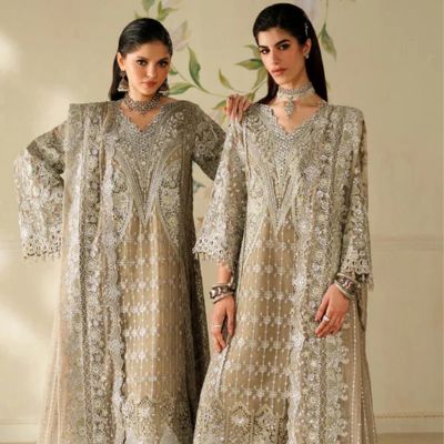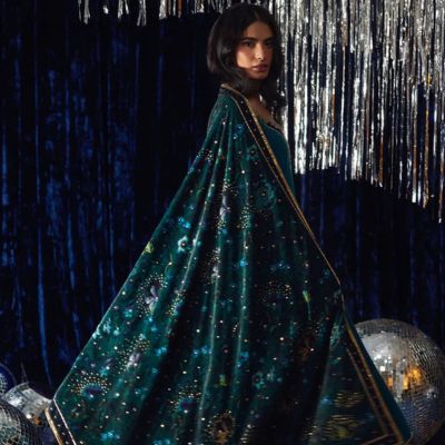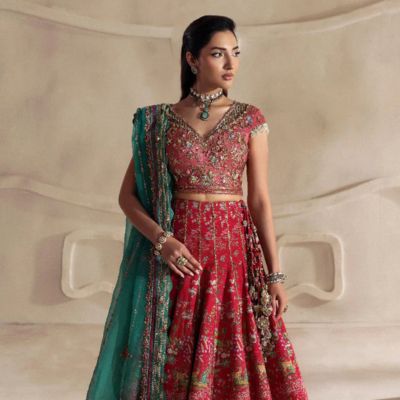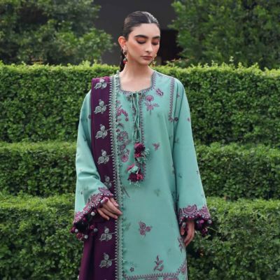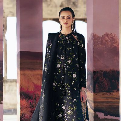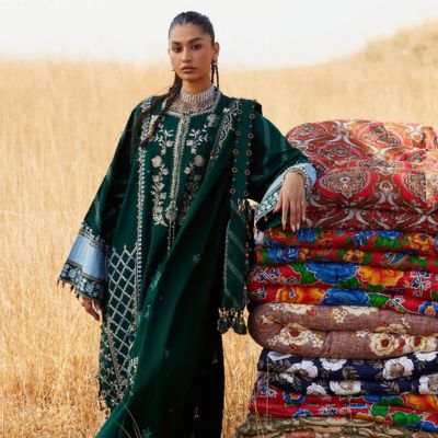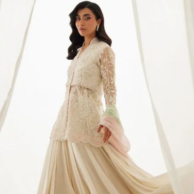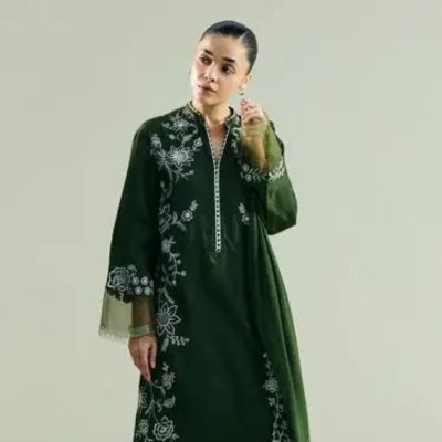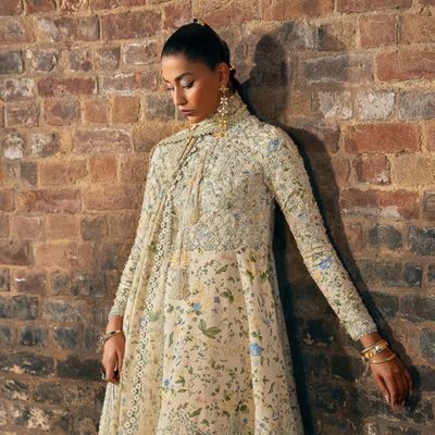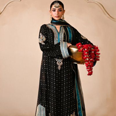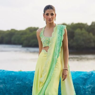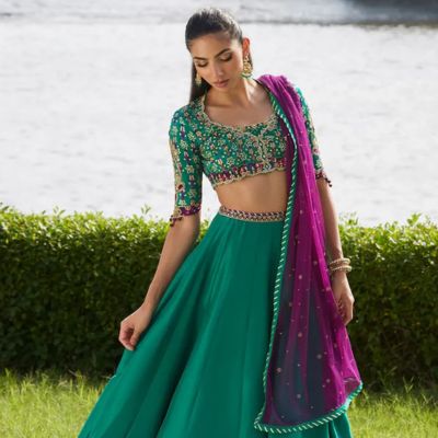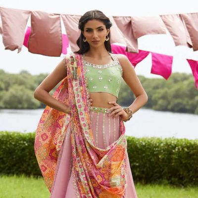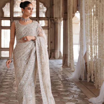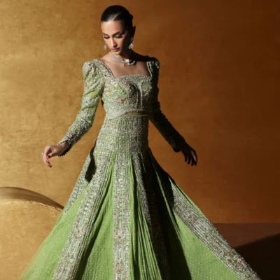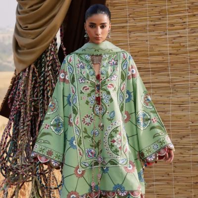 - Sage green organza with four-sided minimal leaf embroidery, sequin details, and a lace border.