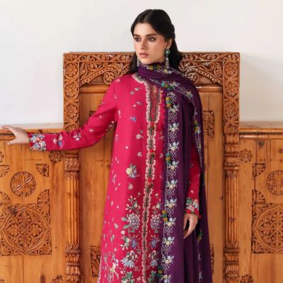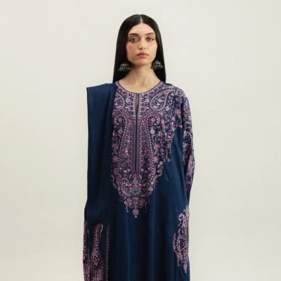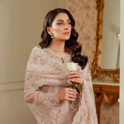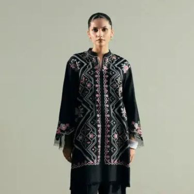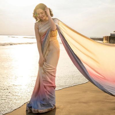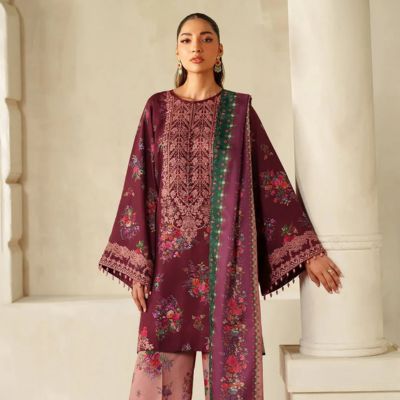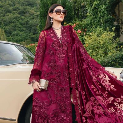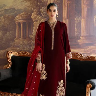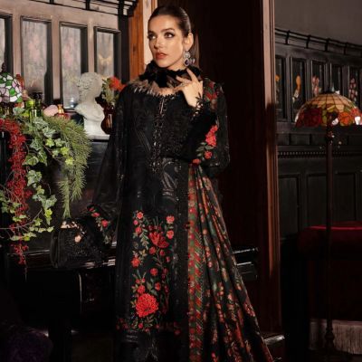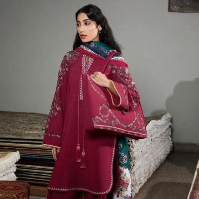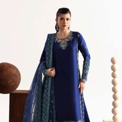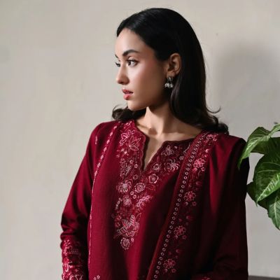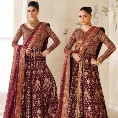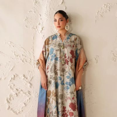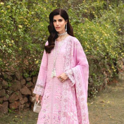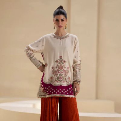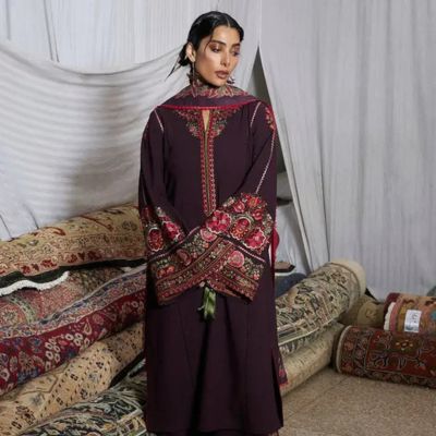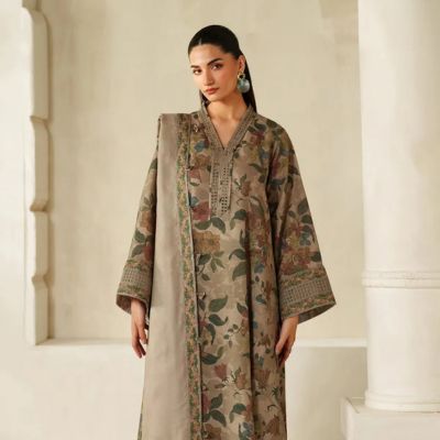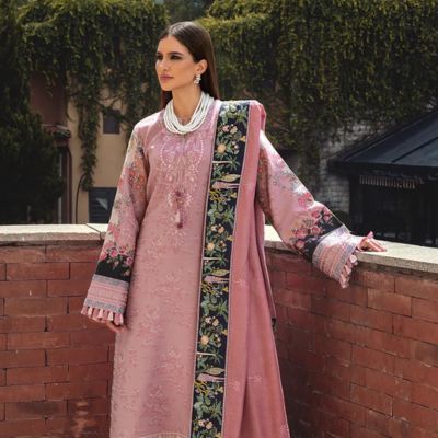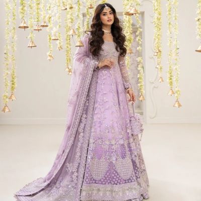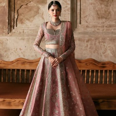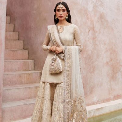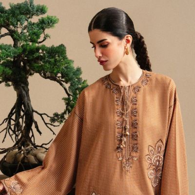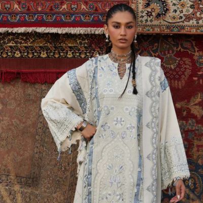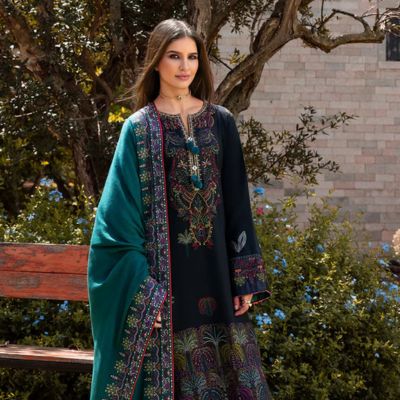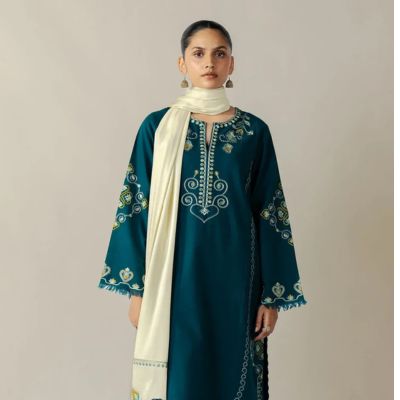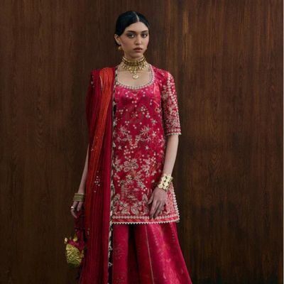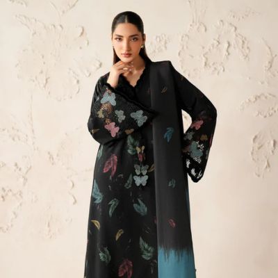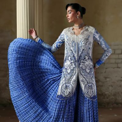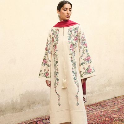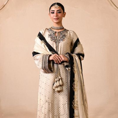 - Sage green organza with four-sided minimal leaf embroidery, sequin details, and a lace border.