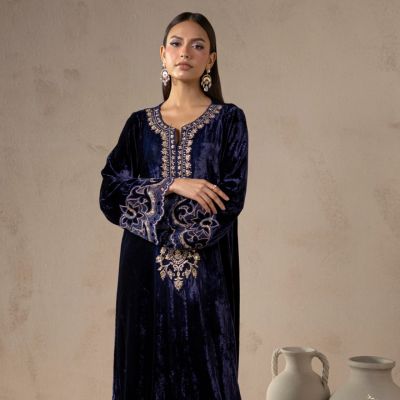 - Sage green, printed velvet half overlapped angrakha with fitted sleeves, embellished with embroidery and lace details.