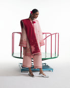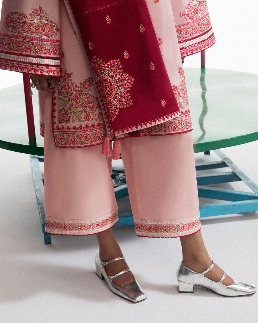 Description: "This elegant light pink ensemble is a tribute to tradition, beautifully detailed with multicolored embroidery across the shirt, bell sleeves, and culottes. The shirt features delicate tassels at the neckline, while the embroidered sleeves add a soft, flowing silhouette. Paired with wide-legged culottes that echo the same intricate patterns, the look is completed with a bold red scarf — richly embroidered and finished with tassels — adding a refined contrast to this graceful outfit.