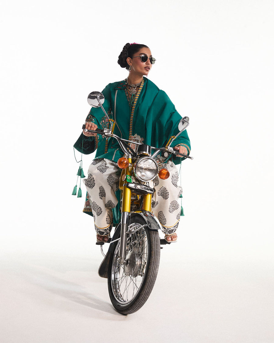 Description: Fusing contemporary style with heritage, this ensemble showcases a teal short shirt richly embellished with multicolor embroidery. The dramatic bell sleeves, embroidered and tipped with tassels, add flair and structure. A screen-printed ivory shalwar, bordered with intricate embroidery, offers refined contrast. Completing the look is a matching embroidered scarf, where tassels and vibrant threadwork reflect a modern twist on timeless tradition.