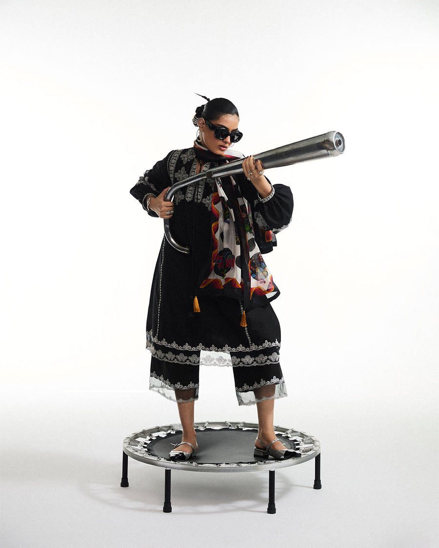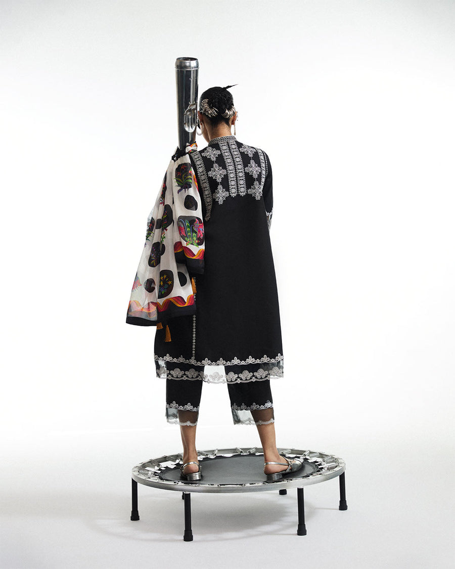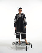 Description: This black ensemble blends classic embroidery with a modern, effortless silhouette. The long shirt is detailed with delicate white threadwork along the neckline, sleeves, and hem, giving the piece quiet texture and depth. Subtle tassels at the front and full balloon sleeves add a sense of movement and shape. It's paired with cropped, wide-leg culottes that mirror the shirt’s embroidery for a seamless finish. A lightweight digitally printed silk scarf introduces soft color and pattern, tying the look together with understated sophistication. The result is a look that feels intentional, composed, and easy to wear.