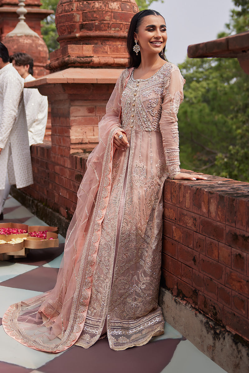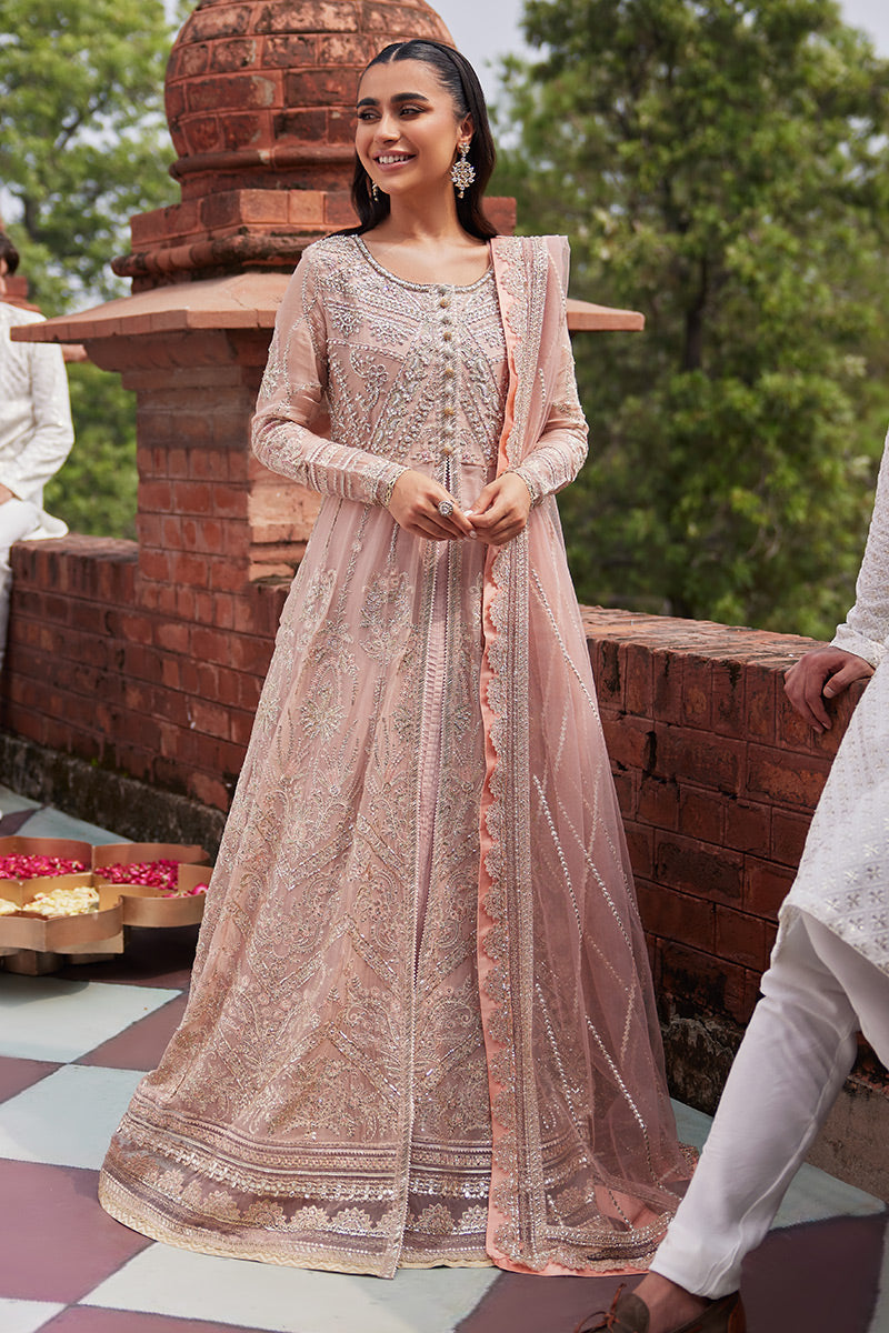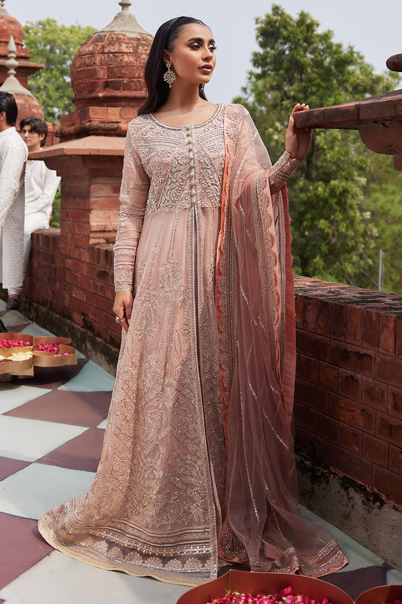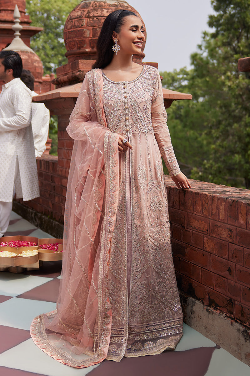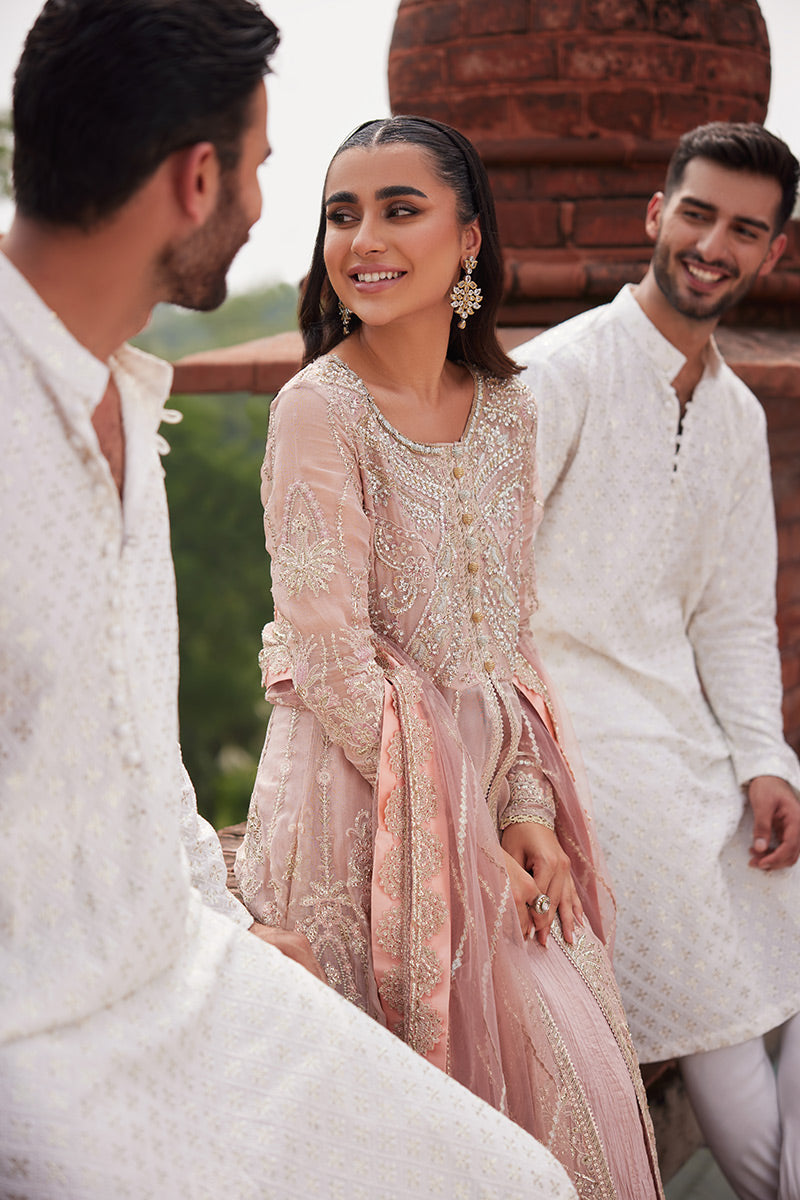 Introducing Taneez, a flared pishwas where elegance is unveiled through meticulously handcrafted embellishments and the delicate shimmer of sequinned borders on exquisite chiffon, set against tea pink canvas. It comes with curated golden and silver tilla buttons thus adding a touch of elegance to the look. Your look is complete with a stunning net dupatta, adorned with meticulously embroidered and sequined borders.