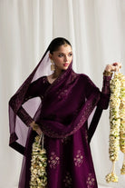 This outstanding plum ensemble features a long raw silk shirt adorned with intricate embroidered motifs across the shirt and sleeves. Each motif is delicately embellished with gold sequins, naqshi, bugle beads, and gold pearls, creating a luxurious and radiant appeal. The same exquisite sequinned embroidery is carried onto the sharara and along the borders of the dupatta, ensuring a cohesive and opulent look. Perfect for weddings, festive occasions, and grand celebrations, this ensemble embodies timeless elegance and masterful craftsmanship.