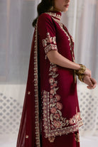 This exquisite maroon formal ensemble features a shirt and wide-leg shalwar, beautifully tailored in luxurious sapphire silk for a rich and lustrous appeal. The outfit is adorned with intricate gold and beige thread embroidery on the neckline, sleeves, hem, and trousers, paired with a graceful georgette chiffon dupatta that adds airy elegance. Lining and facings are crafted from smooth cotton silk, ensuring comfort with a polished finish. Perfect for weddings, festive occasions, and grand celebrations, this design blends traditional craftsmanship with timeless sophistication.