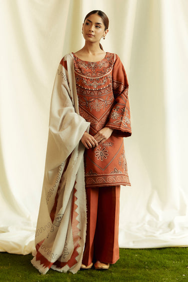 A rust suzani-embroidered shirt, paired with solid-colored pants and a printed shawl, makes for the perfect addition to your fall wardrobe.