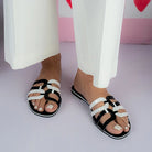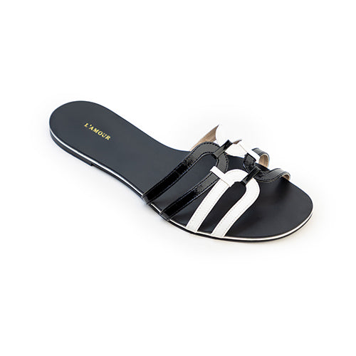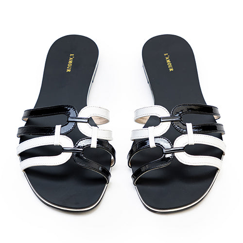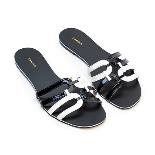 Our 'TWIN' Flats are available in two colorways. This one is crafted in leather, and features a symmetrical interlock pattern in black & white. For the edgy fashionista, this sandal is equal parts trendy and versatile.