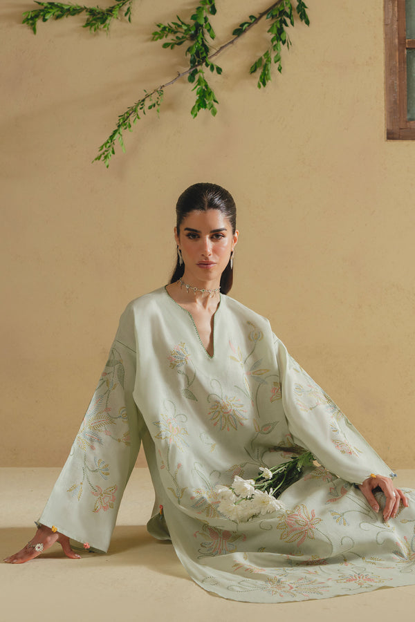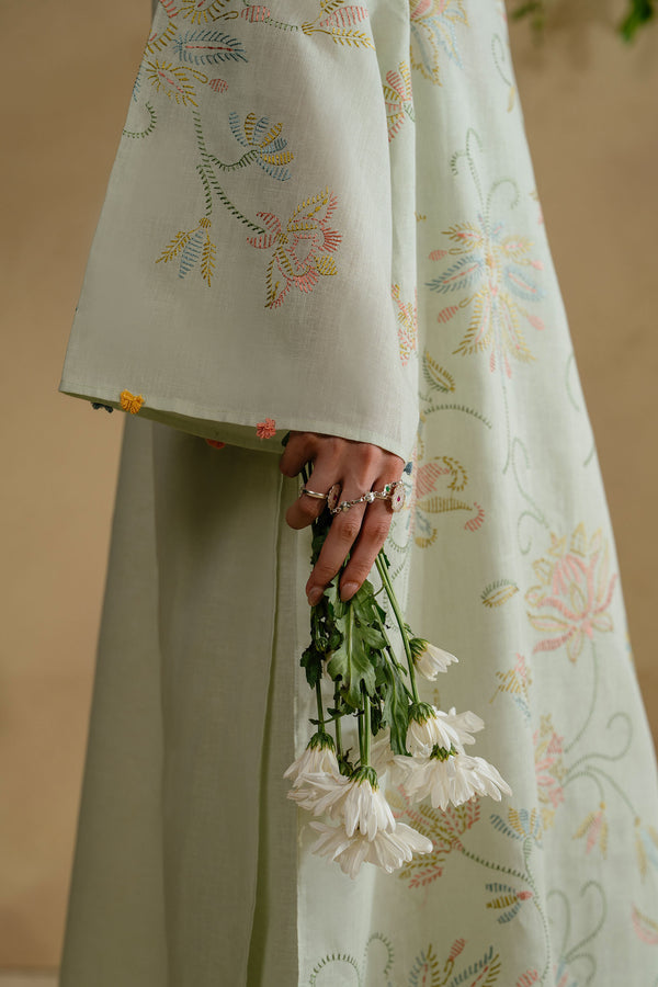 Woven in soft pistachio slub cotton, Vanya is a long, flowing two-piece ensemble that captures the gentle poetry of autumn's greenery. Hand-stitched floral threads in shades of salmon, sage green, olive, and ice blue dance across the fabric, while delicate threadwork adorns the neckline.