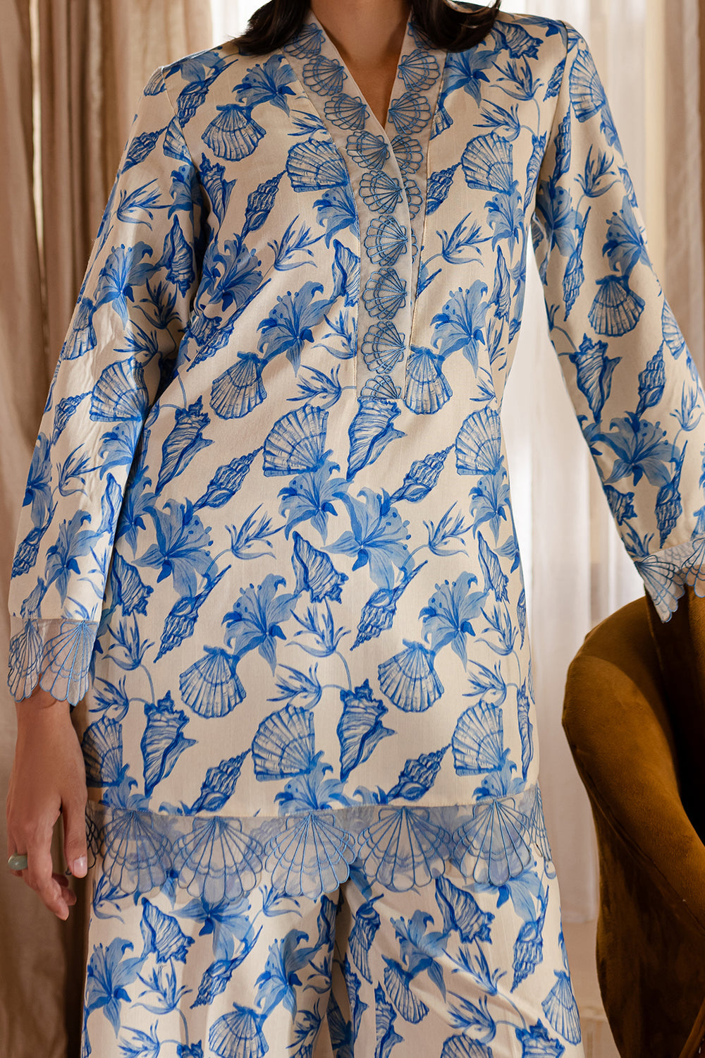 Floral print shirt with embroidered neck, cuffs & Daman, paired with wide legged trousers