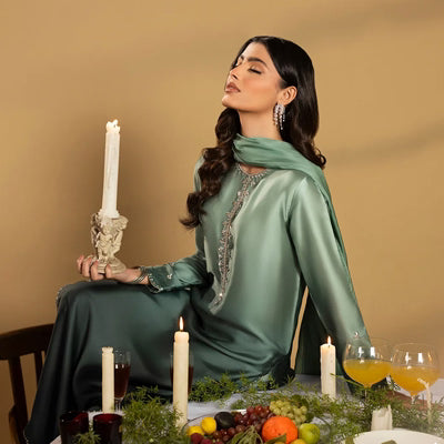 Ayla is a graceful organza ensemble designed to embody modern femininity and timeless luxury. The delicately textured organza shirt is thoughtfully crafted, paired with fluid tissue silk trousers that add movement and comfort. An embroidered organza dupatta completes the look, creating an ethereal and sophisticated silhouette.