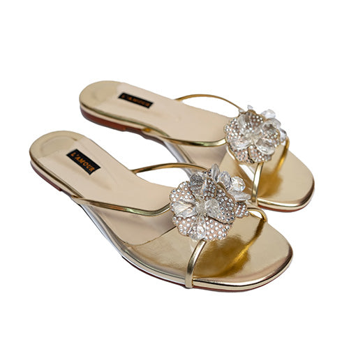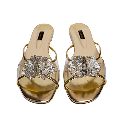 A floral fantasy crafted in ombre toned micro-crystals, the all-new 'Zara' flat features delicate rosettes placed on a PVC strap. Paired with eastern or western ensembles, these flats are the ultimate statement for the modern day fashionista.
