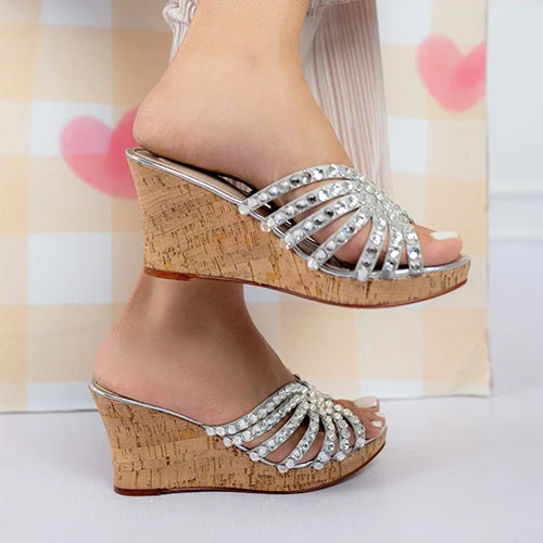 Our signature ZENIA, now in a WEDGE HEELS style. This slide features handstitched crystals in a scalloped pattern offset against a shiny leather base. Add to your collection of staples with this versatile cult favorite.
