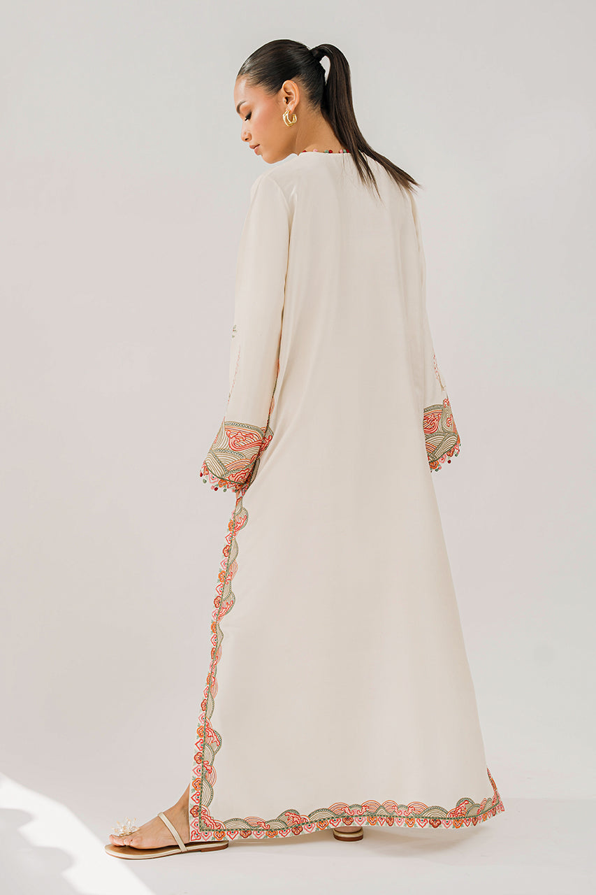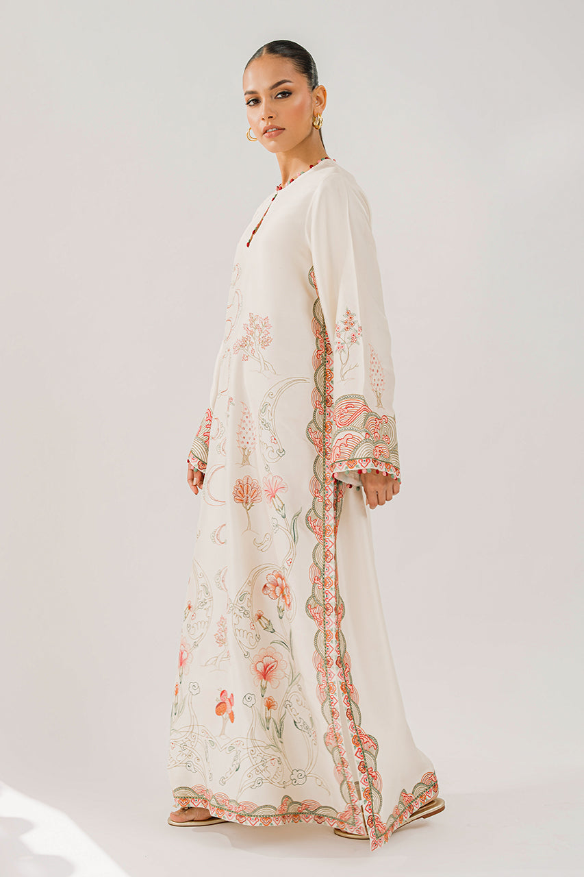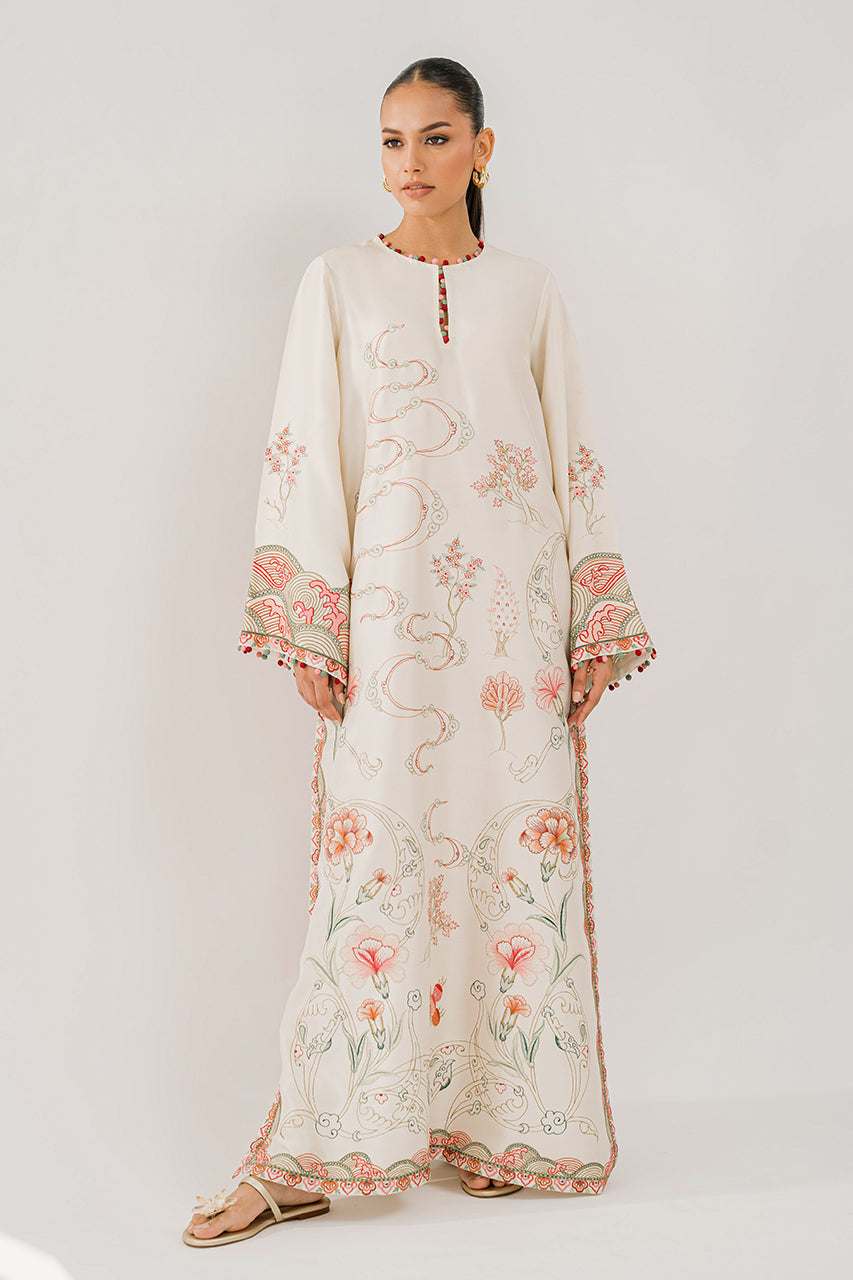 A contemporary rawsilk ivory kaftan features fabric manipulation and painterly embroidery in hues of coral, crimson, and sage.